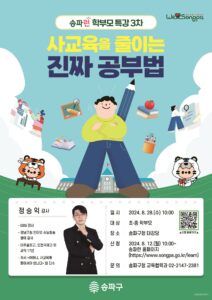 강연은 사전 신청한 학부모 400명을 대상으로 무료로 진행한다. 현장 참석이 어려운 학부모를 위하여 ‘송파런 유튜브’ 채널에서 강연 영상을 제공할 예정이다.